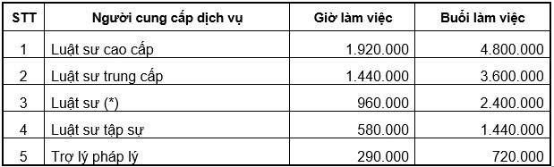 [3] Hệ số áp dụng Luật sư cao cấp, hệ số từ: 2,0; Luật sư cấp trung, hệ số từ: 1,5; Luật sư (tiêu chuẩn), hệ số: 1,0; Luật sư tập sự, hệ số từ: 0,6; Chuyên viên pháp lý, hệ số từ: 0,3.